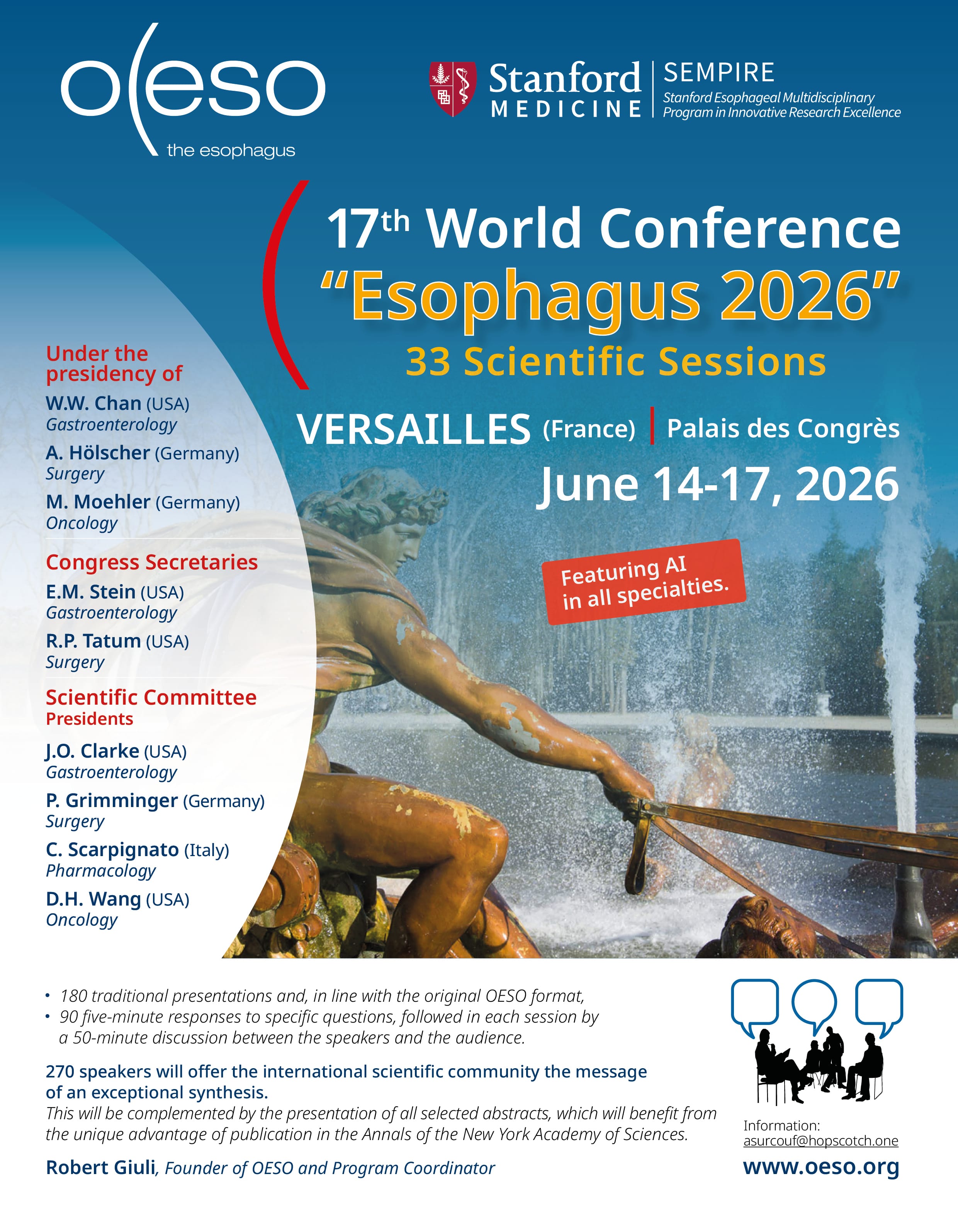 The latest, innovative OESO-SEMPIRE project, proposes a series of “Gatherings in Esophagology” (GiE) at the Abbey of Royaumont in the period between two OESO international congresses, thus maintaining a continuous flow of interest in Esophagology.
