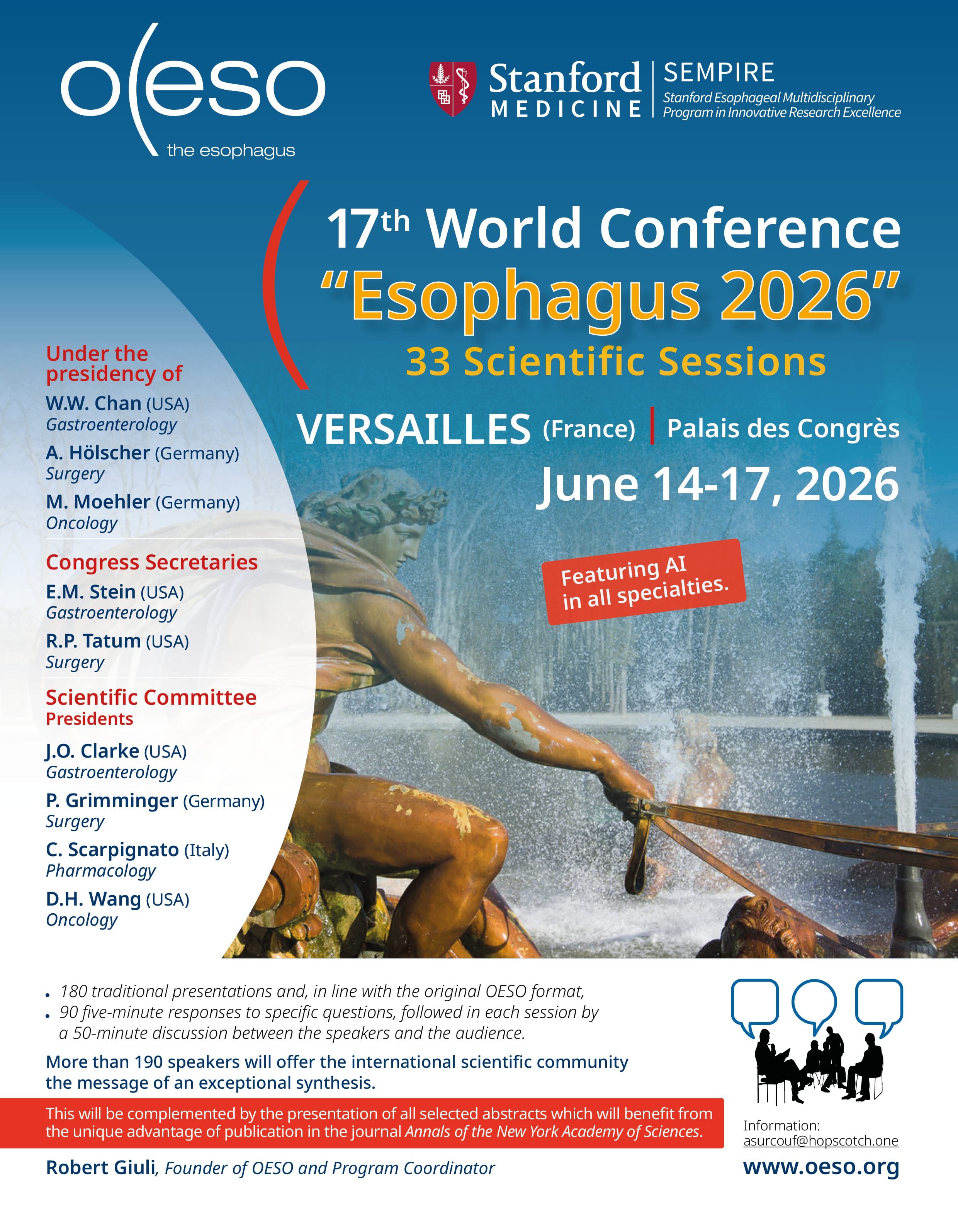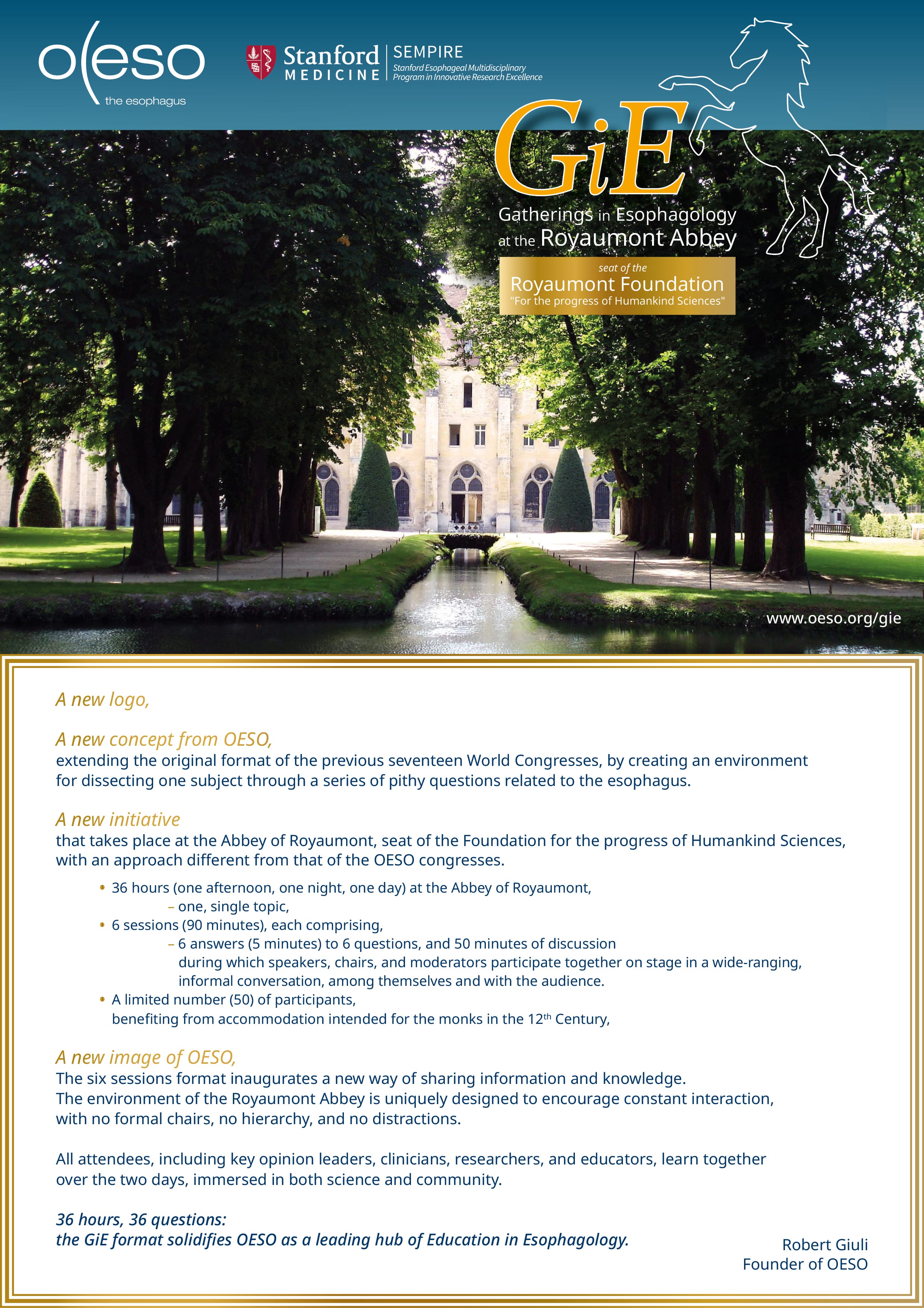The latest, innovative OESO-SEMPIRE project, proposes a series of “Gatherings in Esophagology” (GiE) at the Abbey of Royaumont in the period between two OESO international congresses, thus maintaining a continuous flow of interest in Esophagology.